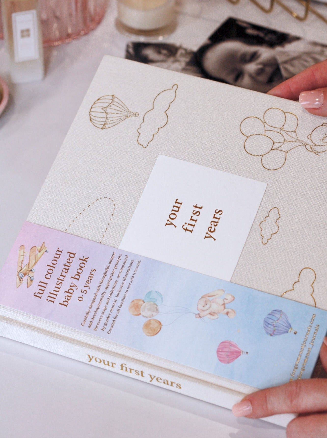 Baby Book ‘Your First Years’ is our beautiful watercolour illustrated Baby Book to guide you to record the first five years of your baby’s life. Document every cherished moment, from their first smile to their first steps. Personalise with baby’s initials or name – a very special keepsake